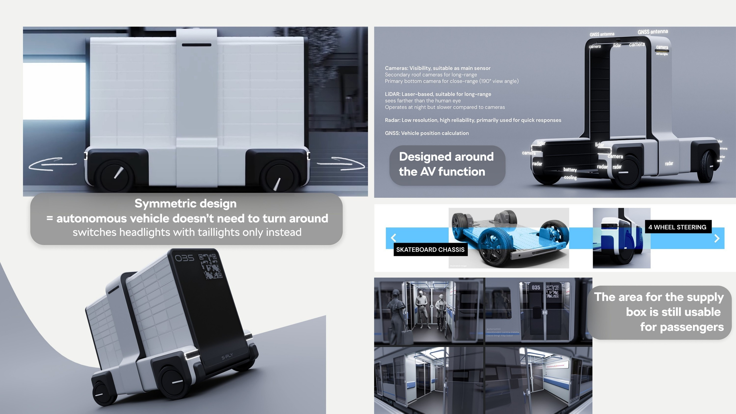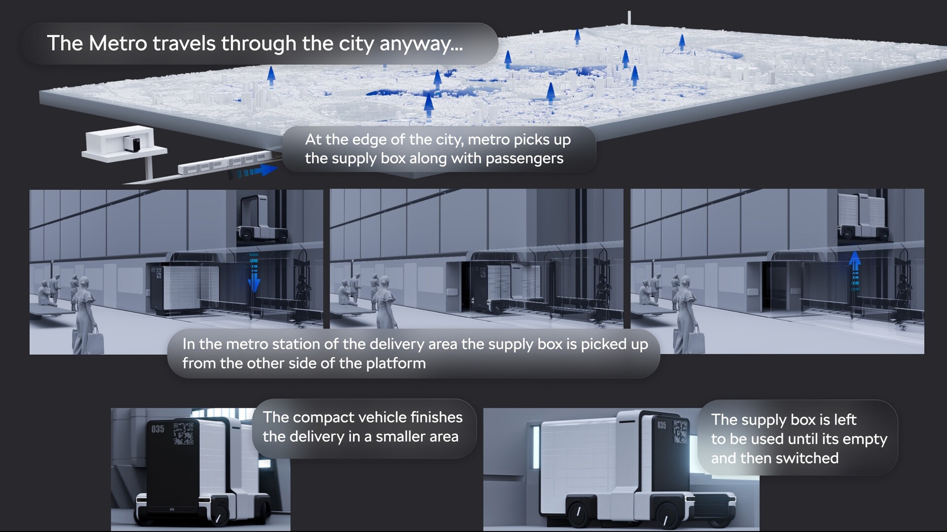 Our design takes most of the commercial transportation and moves it underground, using the already existing underground metro infrastructure. The metro transports our supply box from the edge of the city into the delivery area with passengers, where at the station, our compact vehicle picks it up and makes the final route.